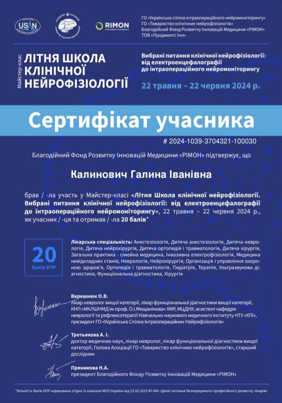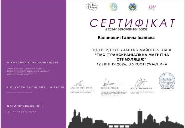 - липень 2024-участь у майстер-класі ТМС ( Транскраніальна магнітна стимуляція)