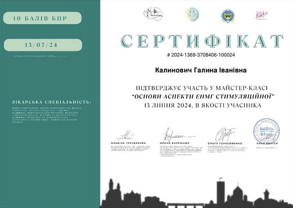 - липень 2024- участь в майстер-класі Основи аспекти ЕНМГ стимуляційної